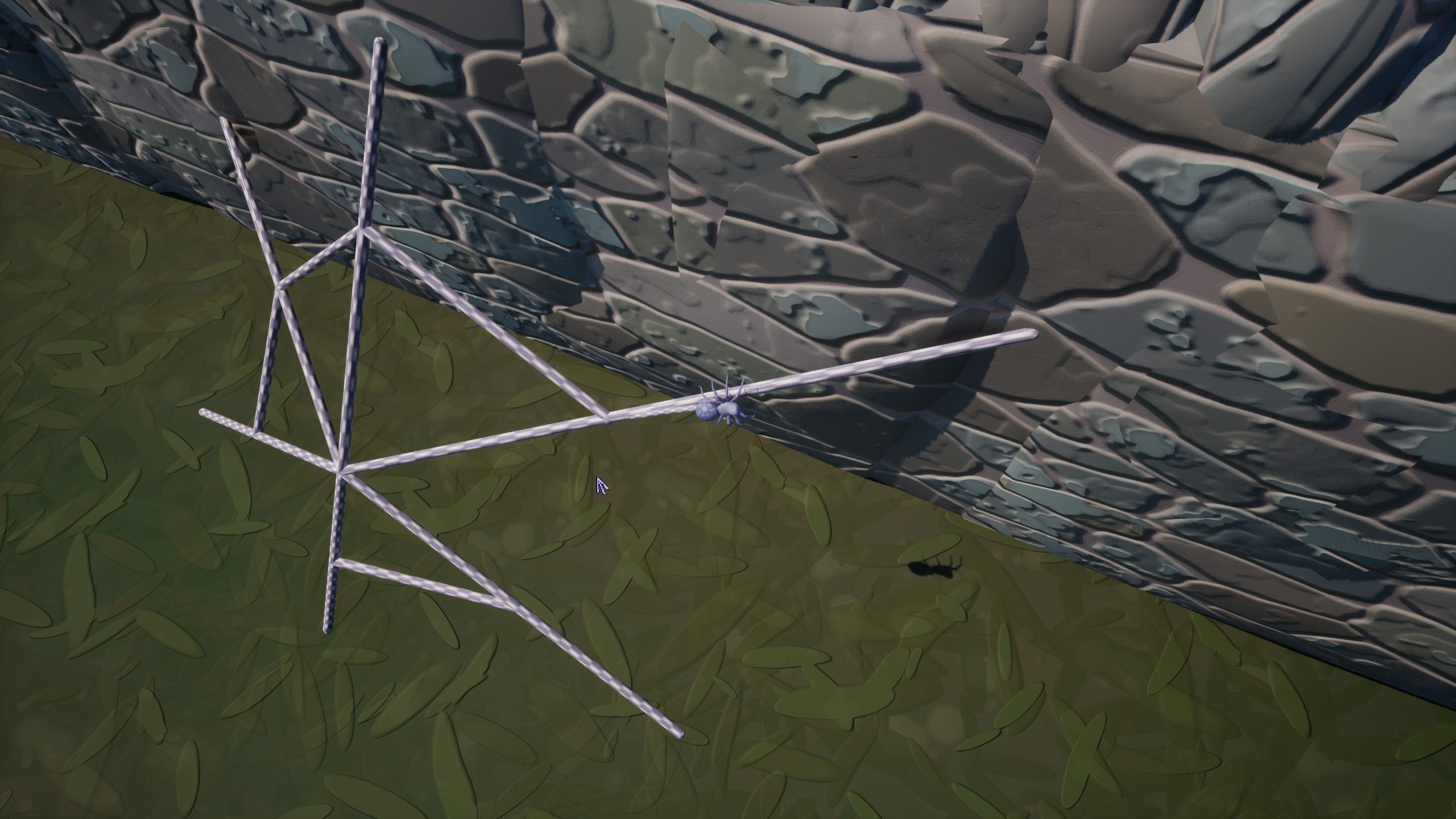 The prototype combines node-based placement of continuing and terminal segments in 3D, traversal on and around player-built webs, and strong visual feedback for placement, snapping, and removal. It was refined across several major versions with formal playtesting, with a custom-rigged spider character (“Jenny”) and environment and materials built in Maya, ZBrush, and the Substance suite.